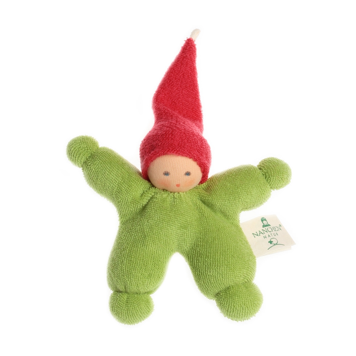 Nanchen Natur Pimpel is een roos handgemaakt popje met pinnemuts. De kleur van de Pimpel pop voor baby kan je kiezen. Dit is hier de roze. De knuffelpop is tevens grijpspeelgoed voor baby. Het gezichtje van het knuffelpopje is met de hand beschilderd met zuivere, natuurlijke kleurstoffen. Net als al onze knuffelpoppen, is ook deze stoffen knuffelpop, de roze, vervaardigd van zuivere bio wol en zuiver bio katoen.