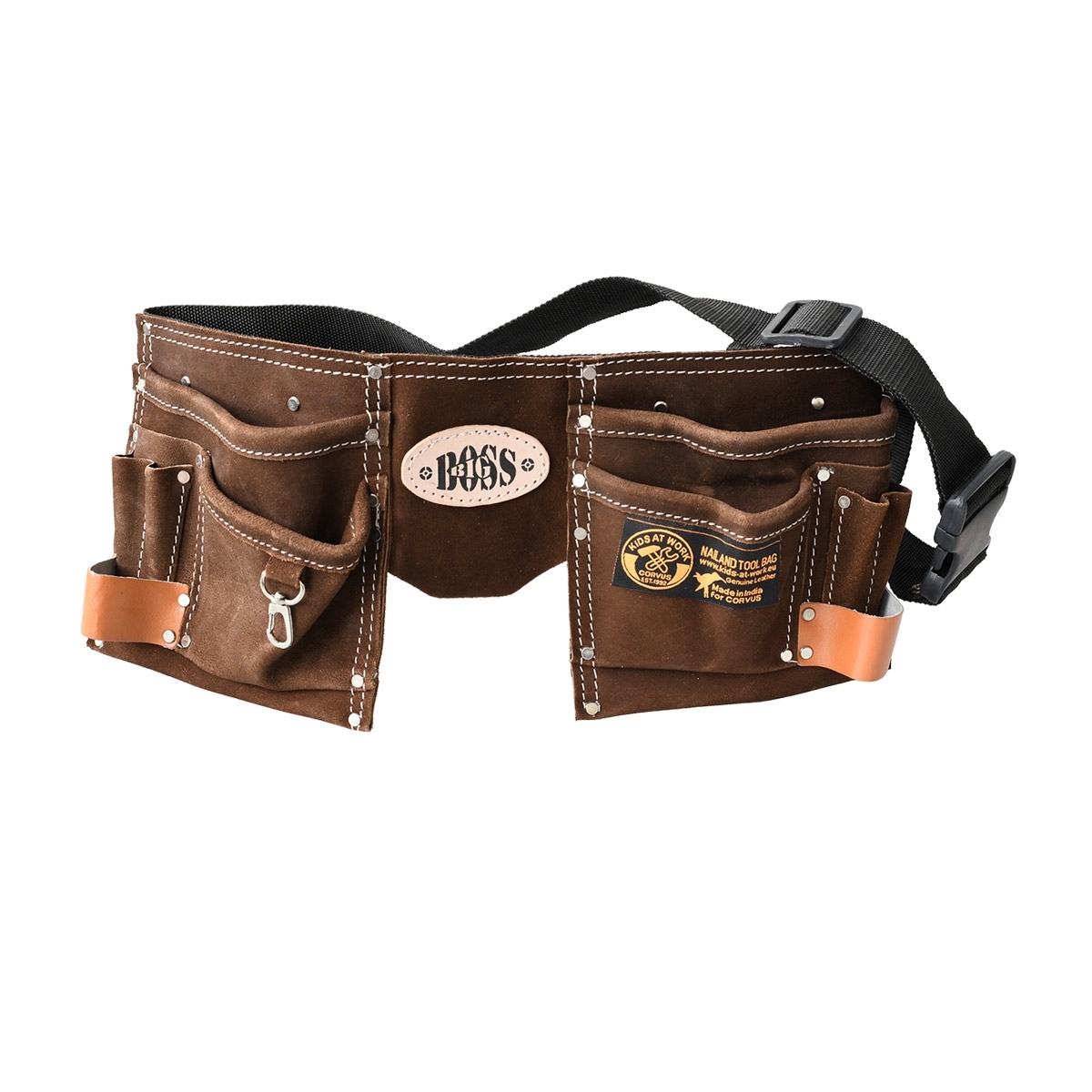 Dubbele lederen gereedschapsriem kinderenLeeftijd: vanaf 6 jaarMateriaal: suède lederAfmetingen: 2 zakjes van 20cm x 20cm met tussenstuk 10cm max lengte riem 130cm