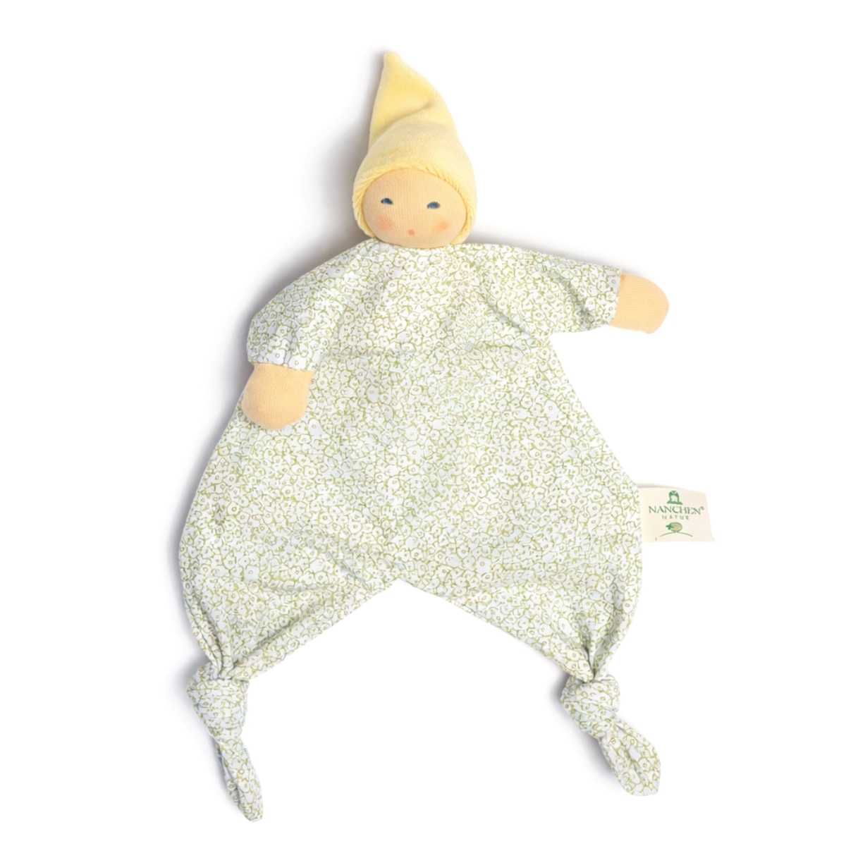 Nanchen bloemenpop met zacht lijfje in zachtgroene tricot. Ze draagt een pinnemuts in lichtgele badstof. Haar handen en handgeschilderd gezichtje zijn van tricot in huidskleur. Haar voeten worden voorgesteld door knopen, wat de verbeelding van een baby stimuleert. De knopen kunnen ook ontknoopt worden.