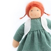 De Nanchen Charlotte pop is een aankleedpop van 38 cm, handgemaakt van biologische wol en katoen. De Waldorf pop draagt een groene pied-de-poule-jurk van zacht biologisch katoen molton, een witte gilet van zuivere wol en oranje leren schoentjes versierd met een klein groen blad om de 'appelsien' sfeer te versterken. Deze Nanchen pop heeft blauwe ogen en rood mohair haar dat eindigt in twee kleine vlechten die naar boven wijzen... net als Pippi Langkous. Haar handgeschilderde gezicht en neutrale uitdrukking zorgen ervoor dat de meisjespop zowel kan lachen als huilen, afhankelijk van de fantasiebehoeften van uw kind.
