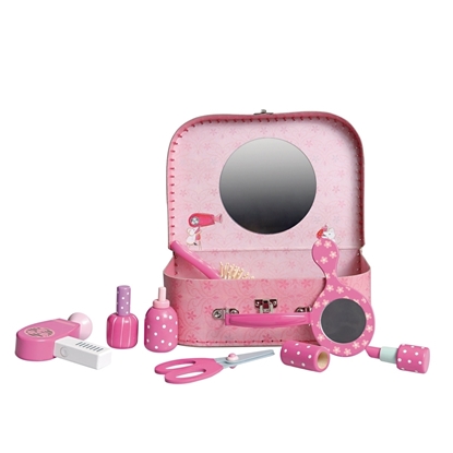 Jouet valise rose ouverte avec miroir, disposé tout autour tout le nécessaire de beauté en bois: brosse à cheveux, sèche-cheveux, ciseaux, rouge à lèvre, vernis à ongle et parfum.
