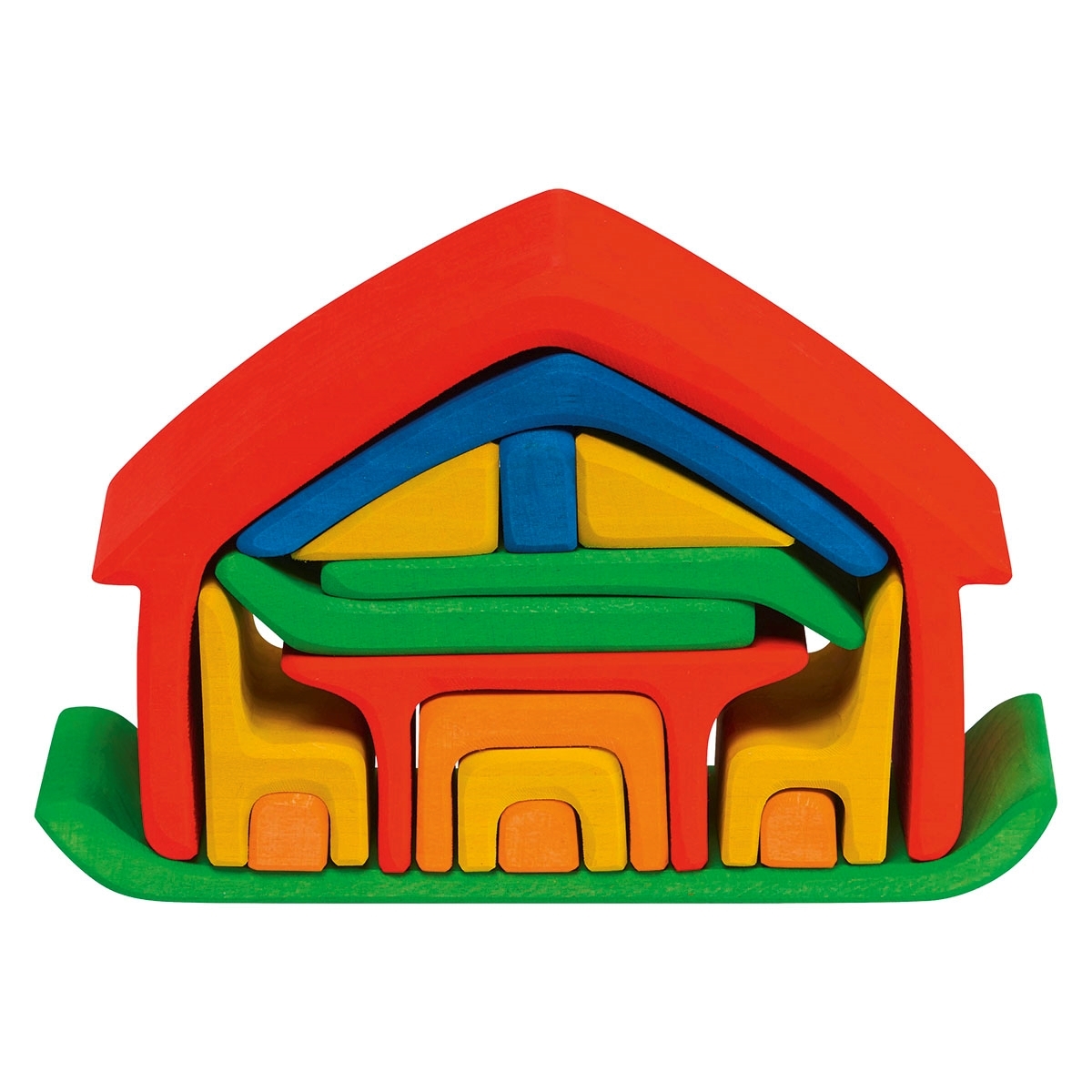 17 onderdelen die een huisje vormen, afzonderlijk te gebruiken als poppenmeubeltjes in een poppenhuis, getint in verschillende kleuren rood, oranje, geel, groen  en blauw.