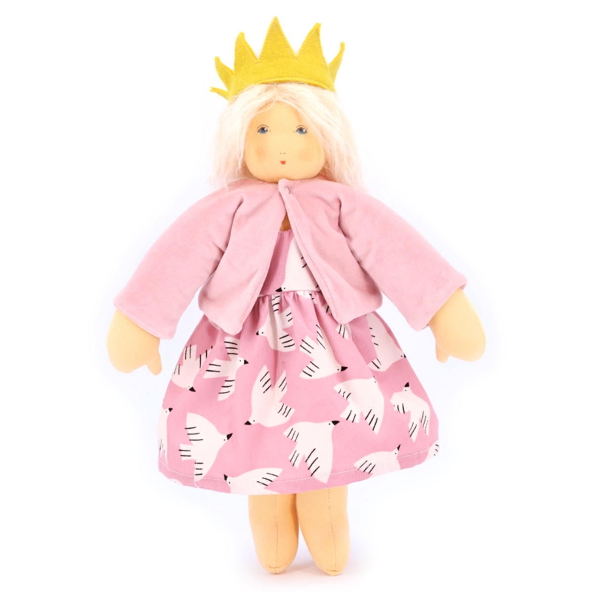 Roze voddenpop RosiLeeftijd: vanaf 3 jaarMateriaal: lichaam en kleding 100% biologisch katoen, vulling 100% biologisch scheerwolAfmetingen: H 40cm